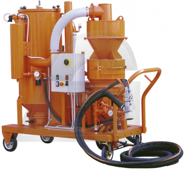 Carro com filtro, bomba vácuo, ciclone, crivador, seleccionador, deposito, mangueira e boquilha.